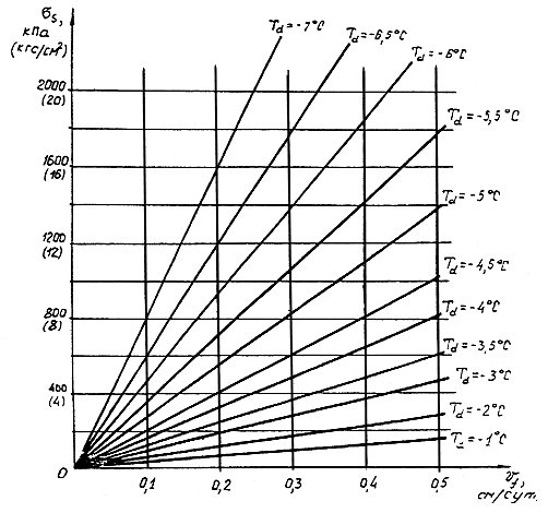 - сопротивление смещению мерзлого грунта относительно фундамента, кПа, определяемое по графику (рис. 1) в зависимости от расчетной температуры