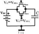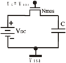 Вначале рассмотрим ключ на одном NМОSТ . Пусть требуется зарядить разряженную до нуля емкость , до положительного потенциала VDC. Для этого к затвору NМОSТ приложили положительный потенциал VG. Пусть цифровая схема, подающая отпирающий потенциал на затвор, имеет напряжение питания, т.е. VG=VDDA. Пусть также VDC может принимать максимальный положительный потенциал VDC MAX = VDDA, и мы хотим зарядить конденсатор до потенциала VDDA.В этом случае электрод NМОSТ , соединенный с конденсатором , играет роль истока, а с VDC - стока . По мере заряда конденсатора и, следовательно, увеличения потенциала истока, уменьшается разность потенциалов затвор-исток VGS.