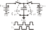 Рис. 3-1.Простейший переключаемый конденсатор (ПК), чувствительный к паразитным емкостям. (Замкнутые состояния ключей не перекрываются во времени.)