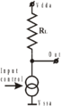 Оставаясь в рамках схем с постоянными параметрами, в качестве простейшего (базового) усилителя исторически предложена единственная схема: последовательно соединенные резистор RL и управляемый источник питания (т.е. активный элемент), на управляющий вход которого подается сигнал, который требуется усилить. Известным нам интегральным управляемым активным элементом является транзистор (в нашем случае МДП транзистор), имеющий в некотором диапазоне характеристику, близкую к характеристике источника тока, то упомянутым управляемым источником питания является Источник Тока, Управляемый Напряжением (ИТУН). (см. Рис.1).