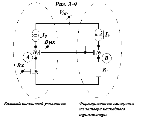Базовый каскодный усилитель совместно со схемой формирователя смещения на затворе каскодного транзистора изображен на рис. 3-9.