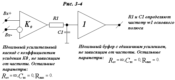Пусть ОУ будет гарантированно устойчивым, т.е. иметь передаточную функцию 1-го порядка. Эквивалентная схема такого ОУ приведена на рис. 3-4.