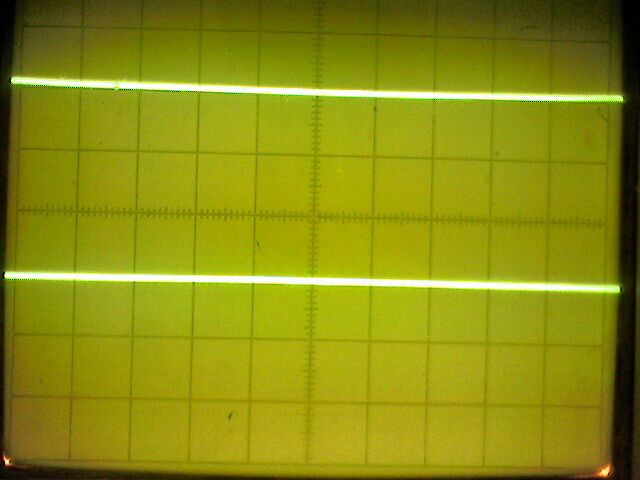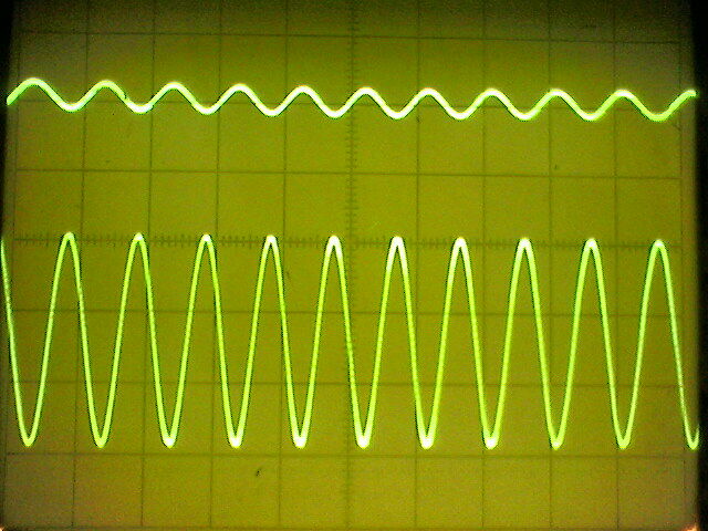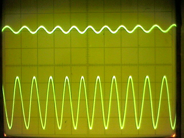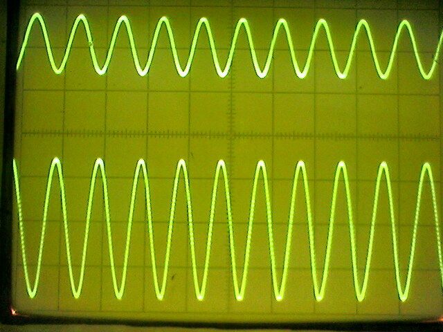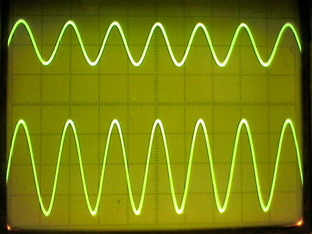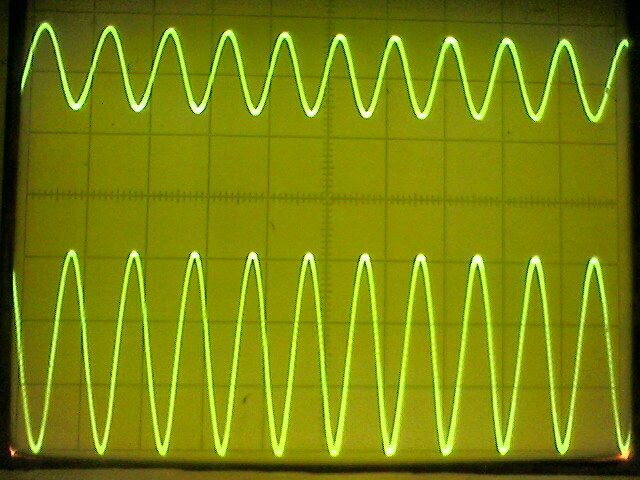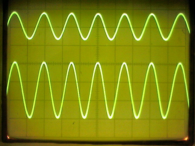 Поставили частоту входа 1 кГц. К первому каналу осциллографа подключили напряжение генератора (сверху, нулевая линия на 2 см вверх), а ко второму напряжение выхода усилителя (снизу, нулевая линия на 2 см вниз). На осциллографе масштаб для обоих каналов поставили 2 В на см и не меняли его. По-моему, второй канал был всё время инвертирован (перевёрнут, т.е. вниз положительное напряжение, а вверх — отрицательное).