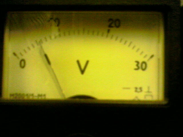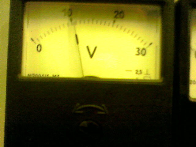 По пункту 2.5 установили размах напряжения на выходе 6 В (3 см) и сфоткали. На входе получился размах где-то 14 мм (2,8 В), а напряжение 1,4 В (7 мм от нуля вверх или вниз).