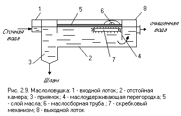 ода движется от одного конца маслоловушки (рис.3) к другому при скорости около 0,01 м/с и времени пребывания 1-3 часа. Маслопродукты всплывают на поверхность, откуда удаляются маслосборным устройством. Здесь успевают осесть только те частицы, траектория которых пересекает дно отстойника в пределах его длины.