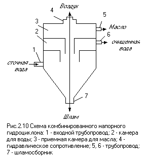 Отделение маслопродуктов в поле действия центробежных сил осуществляют в напорных гидроциклонах. При этом целесообразнее использовать напорный гидроциклон для одновременного выделения и твердых частиц и маслопродуктов.