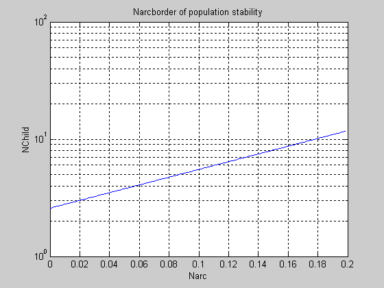 semilogy(Narc,NCh),grid,xlabel('Narc'), ylabel('NChild'),title('Narcborder of population stability')