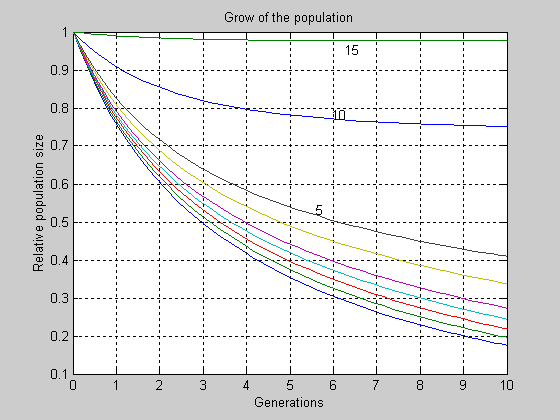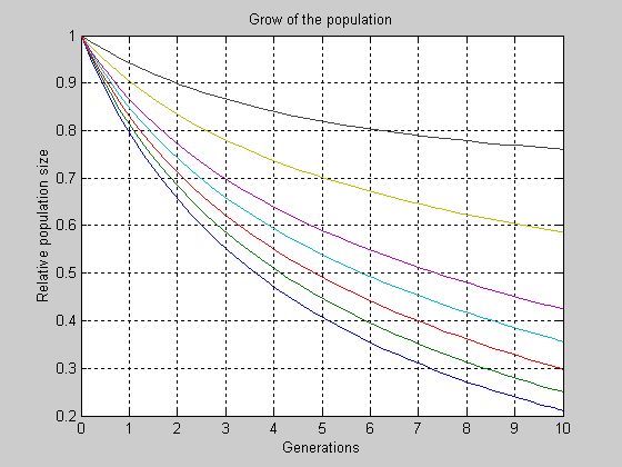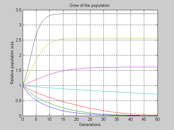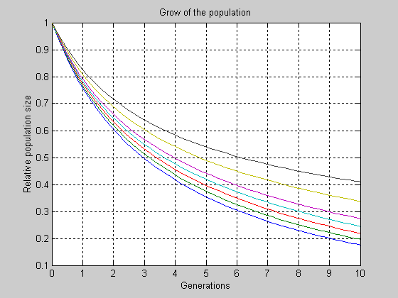 xlabel('Generations'), ylabel('Relative population size'),title('Grow of the population')