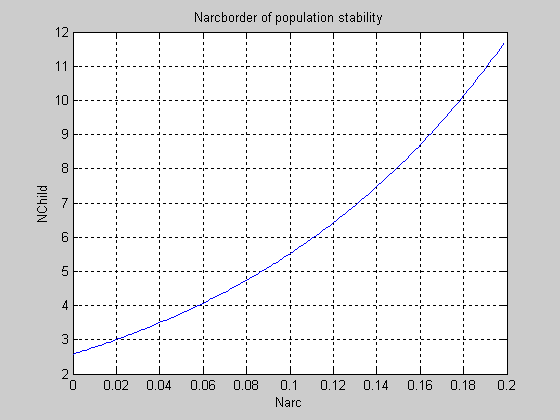 В связи с актуальностью затрагиваемой проблемы рассмотрим ее несколько подробнее. Приняв за основу уже имеющиеся уравнения, найдем границу устойчивости популяции, то-есть стабильности ее начальной относительной численности в плоскости параметров (Narc, NChild). Решаемую задачу можно сформулировать так: построить функцию и(ли) график, позволяющие определить, каким должно быть среднее количество детей у сложившейся брачной пары в популяции, чтобы при любом заданном уровне наркотичности популяции ее численность была стабильной, то-есть производная от численности была равна нулю. Решение вопроса содержится в программе EL12narcborder, приведенной в приложении 4, с ее помощью построены графики, изображенные на фиг.7-10. Кратко прокомментируем программу и графики.За основу взят случай, ранее принятый за «стандартный», для него с помощью первой части программы построены функции рождаемости, смертности и мальтузианская (фиг.7). Заметим, что части программы разделены командой «pause», и для перехода от предыдущей части к следующей следует нажать на клавишу «ввод». На графике виден промежуток положительности N’, следовательно, популяция способна к развитию. Из предыдущих графиков видно, что при больших значениях Narc она эту способность утрачивает.
