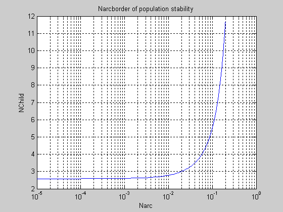 semilogx(Narc,NCh),grid,xlabel('Narc'),ylabel('NChild'), title('Narcborder of population stability')