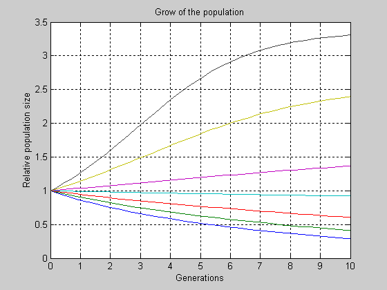 xlabel('Generations'), ylabel('Relative population size'),title('Grow of the population')