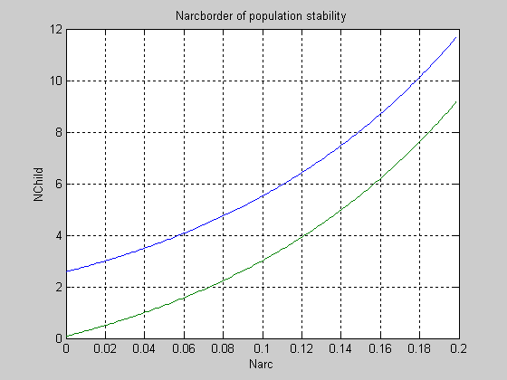 В связи с актуальностью затрагиваемой проблемы рассмотрим ее несколько подробнее. Приняв за основу уже имеющиеся уравнения, найдем границу устойчивости популяции, то-есть стабильности ее начальной относительной численности в плоскости параметров (Narc, NChild). Решаемую задачу можно сформулировать так: построить функцию и(ли) график, позволяющие определить, каким должно быть среднее количество детей у сложившейся брачной пары в популяции, чтобы при любом заданном уровне наркотичности популяции ее численность была стабильной, то-есть производная от численности была равна нулю. Решение вопроса содержится в программе EL12narcborder, приведенной в приложении 4, с ее помощью построены графики, изображенные на фиг.7-10. Кратко прокомментируем программу и графики.За основу взят случай, ранее принятый за «стандартный», для него с помощью первой части программы построены функции рождаемости, смертности и мальтузианская (фиг.7). Заметим, что части программы разделены командой «pause», и для перехода от предыдущей части к следующей следует нажать на клавишу «ввод». На графике виден промежуток положительности N’, следовательно, популяция способна к развитию. Из предыдущих графиков видно, что при больших значениях Narc она эту способность утрачивает.