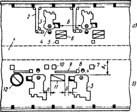 На рис. 3 приведены схемы расположения оборудования в агрегатах горизонтально-ковочных машин с расположением рабочих мест от стены пролета, из которых видно, что нагревательные установки располагаются в одну линию с правой стороны ГКМ. Такое расположение объясняется тем, что правая матрица ГКМ неподвижная, благодаря чему штамповщику при приеме нагретого прутка из печи и установке его в правую матрицу не приходится отходить от рабочего места.