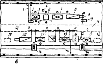 на ГКМ лучше располагать от центрального проезда, как показано на рис. 4. Планировка оборудования по схеме а применяется при массовом и крупносерийном производствах поковок, а по схеме б рекомендуется для серийного производства поковок.