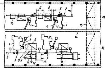 1 — горизонтально-ковочная машина; 2 — однорельсовый путь; 3 — напольный стационарный перекладчик: 4 — наклонный пластинчатый транспортер; 5 — металлический ящик для поковок; 6 — щелевая печь; 7 — стойка однорельсового пути; 8 — кронштейн однорельсового пути, 9 — подставка для прутков; 10 — ковочный патрон; 11 — рельсы передвижного стеллажа: 12 — рольганг передвижного стеллажа; 13 — передвижной стеллаж, 14 — пластинчатый транспортер; I5 — мостовой кран; 16 — стеллаж.