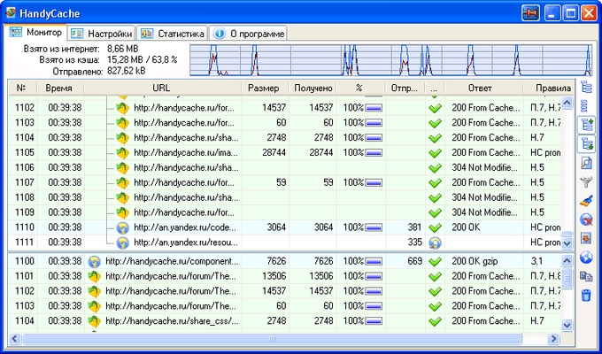 Монитор - главное окно HandyCache, в котором отображается история закачек, текущие активные соединения, их состояние, размер, ответы сервера и примененные к загружаемым файлам правила. Здесь всегда видна оборотная сторона жизни браузера: какие файлы он грузит, откуда, какие ошибки при этом возникают. Кроме этого, можно остановить закачку, загрузить файл повторно или удалить из кэша, открыть в браузере ранее загруженный файл (если тип файла это позволяет), просмотреть на диске каталог кэша, в котором сохранен файл(ы), и многое другое.