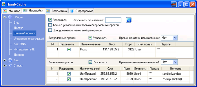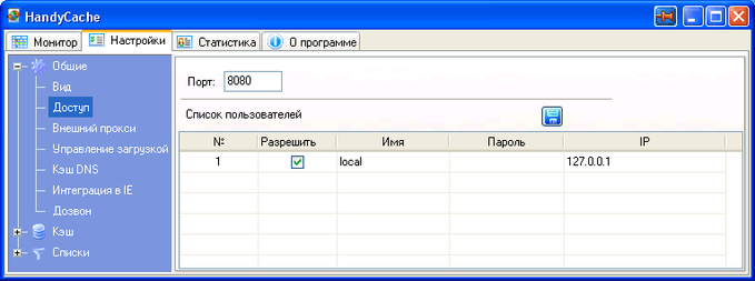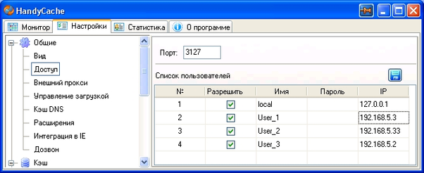 Список, в котором необходимо прописать пользователей, которые будут работать с HandyCache. В колонке "IP" вы можете указать маску IP-адресов (например, 192.168.1.*) или диапазон через "-" (например 192.168.1.4-192.168.1.15), но в этом случае отдельной статистики по каждому IP, разумеется, не будет.