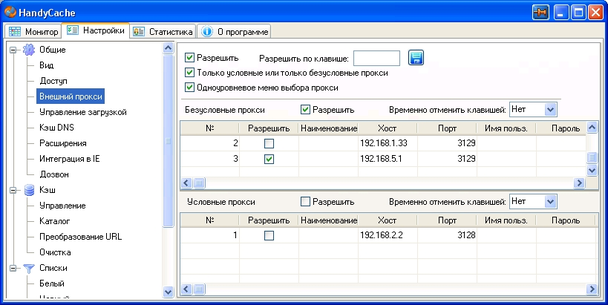 Позволяет настроить списки внешних (родительских) прокси, через которые HC будет выходить в Интернет.