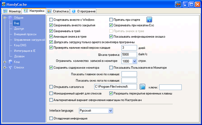 Номер порта, который будет "слушать" HandyCache. На этот порт браузер будет отправлять запросы на открытие страниц. Именно этот порт необходимо прописать в настройках прокси в браузере;