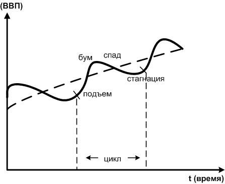 Экономический цикл – это регулярные изменения основных экономических показателей (ВВП, уровня занятости, цен) относительно общей тенденции (тренда - trend) экономического развития. Внешне цикличность представляет собой подъемы и спады в экономическом развитии отдельных стран во времени, вызывая соответствующие изменения в мирохозяйственных связях и оказывая влияние на стабильность функционирования национальной экономики. Причиной цикличности является необходимость периодической реструктуризации экономики в результате воздействия внешних и внутренних факторов (политических, демографических, конкуренции в мировом масштабе и т.д.). По-существу, цикличность – это закономерный результат саморегулирования рыночной экономики, проявляющийся в смещении макроэкономического равновесия от одного его состояния к другому.