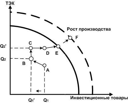 сравниваемых отраслей экономики при неэффективном (точки A,B,C,D) и эффективном (точки E,F) использовании всех ресурсов. На рисунке схематично отражено изменение российской экономики за последние 15 лет. До 2000 года происходил спад производства инвестиционных товаров при росте добычи сырьевых ресурсов и, за счет этого, рост ВВП. Нынешнее положение экономики отражает точка С. Правительство поставило задачу диверсификации экономики (возвращение позиций машиностроительных отраслей, в том числе авиационной отрасли), которая отражает точка D, ресурсосбережения (выход на ГПВ) и общий рост экономики (расширение ГПВ).
