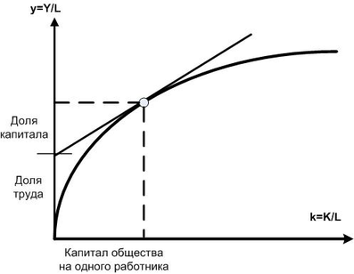 Из анализа приведенной функции видно, что если объем используемого общественного капитала на одного работника возрастает, то также растет, но в меньшей степени, продукт на одного рабочего (предельная производительность труда). Это означает, что хотя функция и положительна, но убывает она по мере прироста продукта и производительности труда.