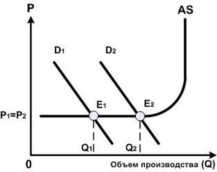 Перемещение кривой совокупного спроса вправо из положения D1 в положение D2 обусловлено увеличением занятости при сохранении низкой зарплаты. Поэтому перемещение точки равновесия от E1 к E2 происходит вдоль кривой совокупного предложения при стабильных ценах.