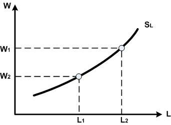 Предложение труда зависит в первую очередь от цены за предлагаемые трудовые услуги (самая нижняя ступень во всех критериях мотивации труда), т.е. от уровня заработной платы. Эта зависимость проявляется в разнообразных условиях и может быть проанализирована с позиций чистой конкуренции или в условиях несовершенной конкуренции, в краткосрочном или долгосрочном периоде и т.д. Рассмотрим вначале некий базовый вариант конкурентного рынка в предположении полной занятости. График предложения на таком рынке представлен на рис. 7.2, где SL – кривая предложения труда, W - ставка заработной платы или, иначе, цена услуг труда (PL), L - количество предлагаемого труда.