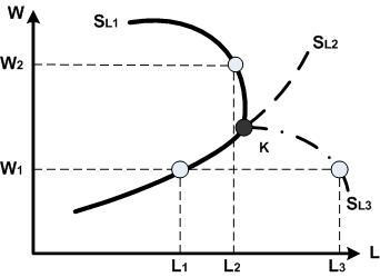 Оба рассмотренных эффекта имеют некоторую аналогию, но по существу они находятся в противоречии один другому. При этом кривая предложения труда отражает единство двух тенденций (SL2). Первая связана с эффектом замещения свободного времени работника под влиянием растущей заработной платы, вторая обусловлена эффектом дохода, когда высокая заработная плата и на ее основе высокий уровень благосостояния служат источником увеличения свободного времени и, следовательно, сокращения предложения труда.