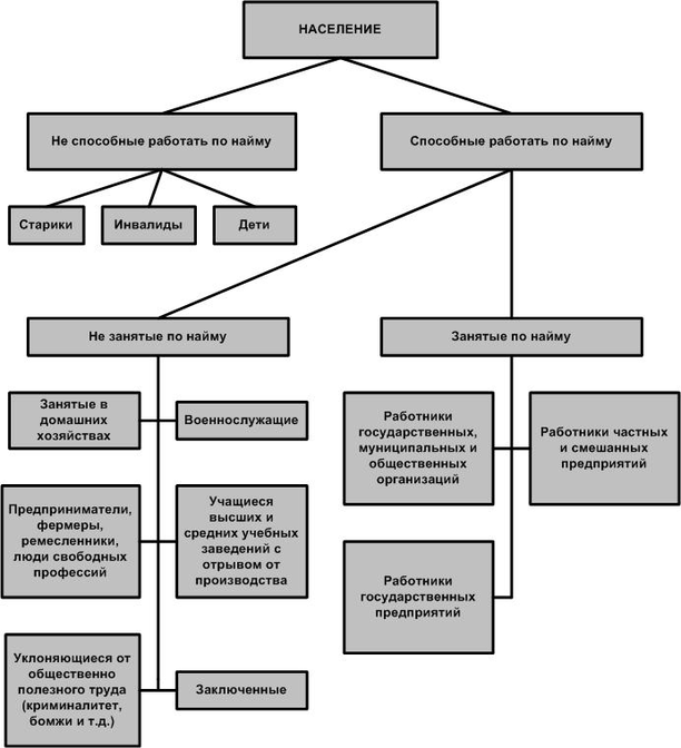 Рынок труда имеет сложное строение. Прежде всего, из общей численности населения необходимо выделить ту его часть, которая способна работать по найму. Принято, что не способны работать по найму дети, старики (люди пенсионного возраста) и инвалиды. Однако, как это видно из диаграммы, большой процент людей, способных работать по найму, предпочитают заниматься домашним хозяйством или зарабатывать самостоятельно. Это – фермеры, предприниматели, люди свободных профессий (адвокаты, ремесленники, артисты и т.д.). Большой процент трудоспособного населения составляют учащиеся высших и средних учебных заведений. В большинстве развитых стран армия переведена на контрактную систему, т.е. военнослужащих следует отнести к людям, работающим по найму. В России процесс перевода армии на контрактную основу только начинается.