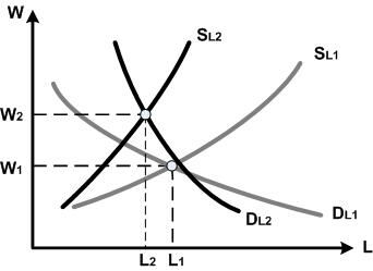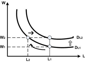 На графике при ставке заработной платы W1 спрос на труд равен L1. Если заработная плата возрастает до величины W2, то спрос на труд уменьшается до L2. Но, принимая во внимание, что рост заработной платы вызывает повышение производительности труда, спрос на труд в этом случае вновь возрастает до L1, и кривая спроса сдвинется вправо из положения DL1 в положение DL2 – в этом новом положении она характеризует результат влияния заработной платы на производительность и спрос на труд.