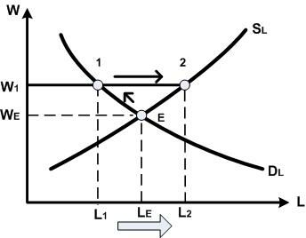 Начальное положение равновесия – точка Е. При сокращении количества работников новое равновесие установится в точке 1, которому соответствует более высокий уровень зарплаты, но уменьшается занятость на величину (LЕ – L1). Новому уровню зарплаты W1, который устанавливается по требованию профсоюза, отвечает более высокое предложение (точка 2). Снижение занятости, соответствующее новому уровню зарплаты, составит фактически разность (L2 – L1). Таким образом, вмешательство профсоюза привело к повышению зарплаты и росту безработицы.