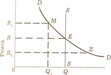 Общее предложение земли в отличие от других факторов производства относительно фиксировано природой и не может быть увеличено в ответ на более высокую цену или уменьшено в случае низкой цены. Кривая предложения на землю является фиксированной. Кривые спроса и предложения пересекаются в равновесной точке Е. Рента имеет тенденцию колебаться вокруг этой точки. Почему? Если бы рента поднялась выше точки равновесия до точки М, то спрос на землю уменьшился бы до Q; и часть земли оказалась бы незанятой: Q — Q . Некоторые земельные собственники были бы не в состоянии сдать ее в аренду и вынуждены были бы предлагать земельные участки за более низкую плату. По таким же причинам рента не может оставаться долго ниже точки равновесия, например в точке R2. Возросший спрос на земельные участки обусловил бы повышение ренты. Только в точке равновесия общее количество земли, на которую предъявляется спрос, равно ее предложению. В этом смысле предложение и спрос определяют цену земли.