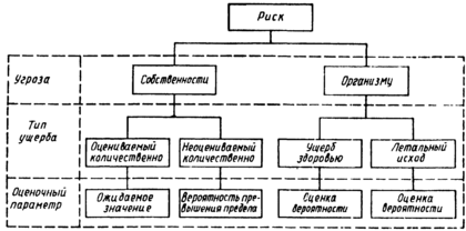 При угрозе здоровью ущерб в денежном выражении можно оценить только частично в виде расходов на оплату листков нетрудоспособности и подмену персонала. Еще труднее в денежном виде оценить ущерб от летальных исходов. Поэтому риск, связанный с несчастными случаями, оценивают вероятностями. Таким образом, единицы измерения риска могут быть различными в том случае, когда существует угроза здоровью, и тогда, когда существует угроза собственности. Поэтому, когда одновременно существует угроза здоровью и собственности, риск целесообразно записывать в векторном виде с различными единицами измерения по координатным осям: