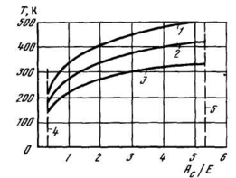 Из рис. 3 видно, что температура тела в космическом пространстве может иметь самые различные значения в зависимости от свойств поверхности и удаления от Солнца. Так, для сферы из полированного алюминия (AJE = 5,2) равновесная температура составляет 150°С (423 К); для той же сферы, покрытой белой эмалевой краской (AJE = 0,19), равновесная температура достигает -89°С (184 К).