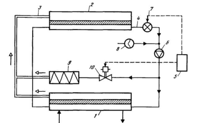/ - емкость для хранения хладагента; 2 - клапан подачи хладагента; 3 - дозатор хладагента; 4 - испарительный теплообменник; 5 - радиационный теплообменник, 6 -клапан постоянного перепада давления; 7 - блок регулирования температуры, 8,9 -магистрали внутреннего контура