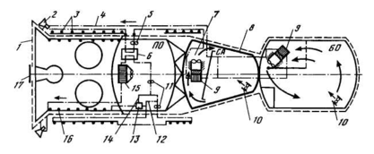 17 — подвижная крышка сопла двигателя; АО - агрегатный отсек; БО - бытовой отсек; ПО -
