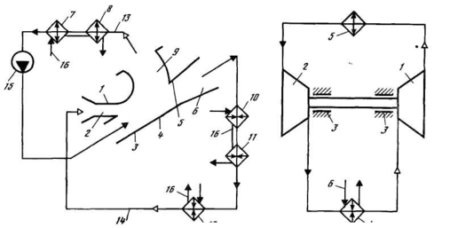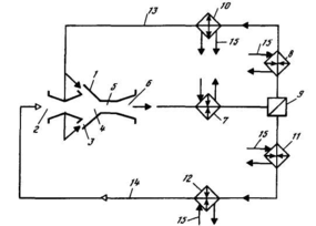 потока; 11 - нагреватель; 12 - теплообменник-разделитель; 13 - "холодный" контур, 14 -