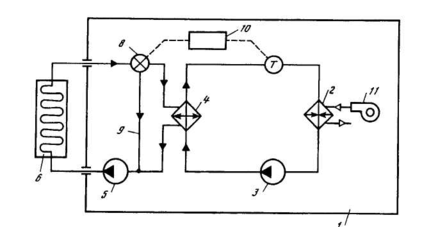 1 - гермоотсек; 2 - теплообменник-конденсатор; 3 - гидронасос внутреннего контура; 4 -жидкостно-жидкостный теплообменник; 5 - гидронасос наружного контура, 6 -радиационный теплообменник; 7 — управляющий датчик температуры; 8 - регулятор расхода хладагента; 9 - холодный теплоноситель; 10 - блок управления; 11 - вентилятор