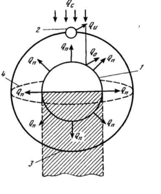 Потоки: gc - солнечного излучения; Qn -собственного излучения Земли; QQ - отраженного от Земли солнечного излучения; <2и - тепловой поток, излучаемый поверхностью косми-