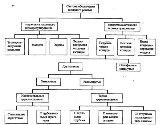 Классификация систем приведена на рис. 4. Система обеспечения теплового режима представляет собой совокупность контуров, блоков, оборудования и агрегатов, регулирующих внешний и внутренний теплообмен космического аппарата. Она делится на две подсистемы: пассивного и активного терморегулирования.