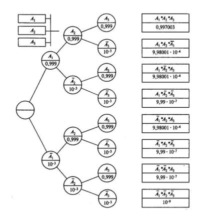 В прямоугольниках справа от конечных узлов на рис. 11.11 еще раз указан результат события, соответствующий пути к этому конечному узлу. В рассматриваемом примере с тремя параллельно работающими компонентами в прямоугольниках указаны результирующие вероятности для состояния системы, которые при независимости выхода из строя отдельных компонентов получаются простым перемножением отдельных вероятностей (вероятность ЧП в рассматриваемый отрезок времени принята одинаковой для каждого из трех компонентов: qi = 10–3; i = 1, 2, 3).