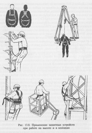 Безопасное проведение работ обеспечивается также путем применения индивидуальных защитных устройств. Так, при работе на высоте, в колодцах и других ограниченных объемах необходимо использовать спасательные пояса, страхующие канаты (рис. 13.8), а также СИЗ.