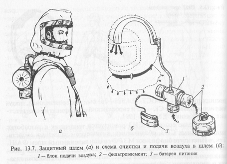 Для работ в особо опасных условиях (в изолированных объемах, при ремонте нагревательных печей, газовых сетей и т. п.) и чрезвычайных ситуациях (при пожаре, аварийном выбросе химических или радиоактивных веществ и т. п.) применяют ИСИЗ и различные индивидуальные устройства. Находят применение ИСИЗ от теплового, химического, ионизирующего и бактериологического воздействия. Номенклатура таких ИСИЗ постоянно расширяется. Как правило, они обеспечивают комплексную защиту человека от травмоопасных и вредных факторов, создавая одновременно защиту органов зрения, слуха, дыхания, а также защиту отдельных частей тела человека. На рис. 13.7 показана схема СИЗ, предназначенного для работы в условиях повышенного аэрозольного загрязнения рабочей зоны.
