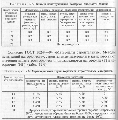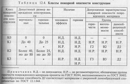 По пожарной опасности строительные конструкции подразделяются на классы: К0, К1, К2, К3 (ГОСТ 30-403-95 «Конструкции строительные. Метод определения пожарной опасности»). Класс пожарной опасности конструкции определяется по табл. 12.4 (по наименее благоприятному фактору).
