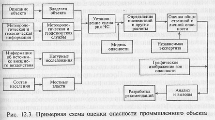 Примерная схема оценки опасности промышленного объекта представлена на рис. 12.3. Оценка может проводиться с применением различных методов анализа повреждений и дефектов, в том числе и с построением дерева отказов и дерева событий.