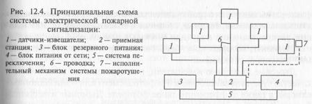 Пожарная сигнализация должна быстро и точно сообщать о пожаре с указанием места его возникновения. Наиболее надежной системой пожарной сигнализации является электрическая пожарная сигнализация. Наиболее совершенные виды такой сигнализации дополнительно обеспечивают автоматический ввод в действие предусмотренных на объекте средств пожаротушения. Принципиальная схема электрической системы сигнализации представлена на рис. 12.4. Она включает пожарные извещатели, установленные в защищаемых помещениях и включенные в сигнальную линию; приемно-контрольную станцию, источник питания, звуковые и световые средства сигнализации, а также автоматические установки пожаротушения и дымоудаления.