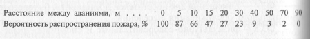 Распространение пожаров и превращение их в сплошные пожары при прочих равных условиях определяется плотностью застройки территории объекта. О влиянии плотности размещения зданий и сооружений на вероятность распространения пожара можно судить по ориентировочным данным, приведенным ниже: