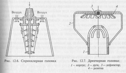 Для пожаротушения в помещениях используют автоматические огнегасительные устройства. Наиболее широкое распространение получили установки, которые в качестве распределительных устройств используют спринклерные (рис. 12.6) или дренчерные (12.7) головки.
