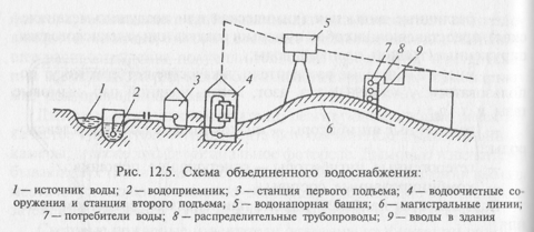 Принципиальная схема устройства системы объединенного водоснабжения показана на рис. 12.5. Вода из естественного источника поступает в водоприемник и далее насосами станции первого подъема подается в сооружение на очистку, затем по водоводам в пожарорегулирующее сооружение (водонапорную башню) и далее по магистральным водопроводным линиям к вводам в здания. Устройство водонапорных сооружений связано с неравномерностью потребления воды по часам суток. Как правило, сеть противопожарного водопровода делают кольцевой, обеспечивающей две линии подачи воды и тем самым высокую надежность водообеспечения.